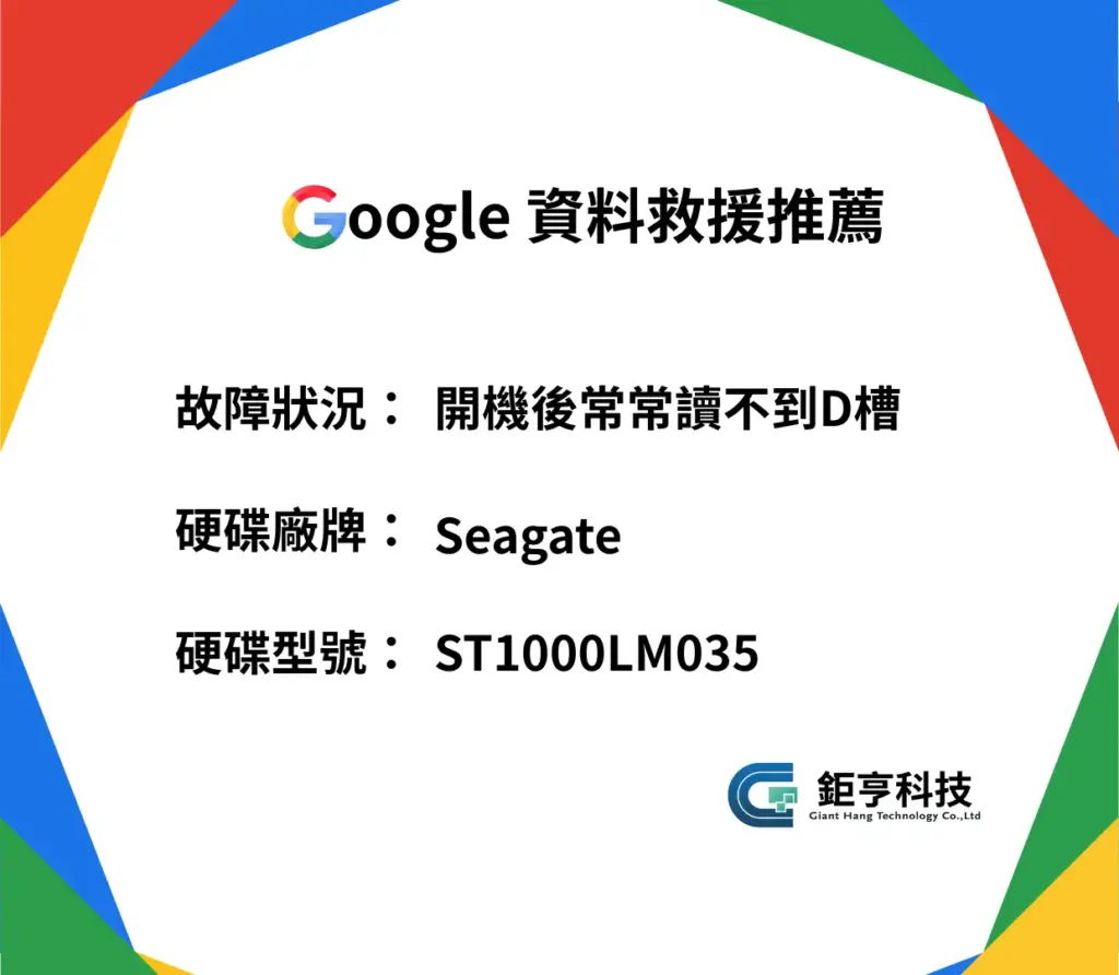 GOOGLE 資料救援推薦網友筆電老舊經常當機,讀不到D槽,也無法備份備份全毀還有救嗎?記憶卡+筆電硬碟同時故障,女兒珍貴成長照片差點消失!Seagate讀寫頭損壞救援實例,98%完美復原+暖心優惠的感動故事。 2025-09-03
