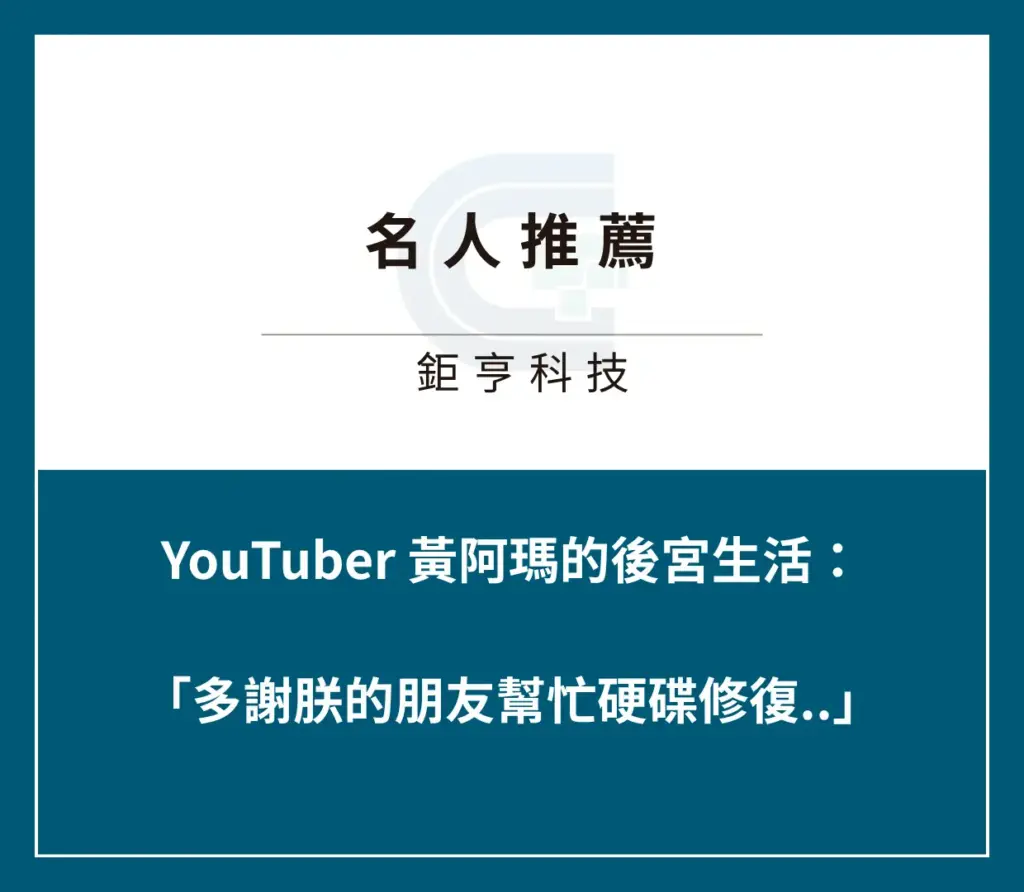 我們知道YouTuber的硬碟就是生存命脈!黃阿瑪:「朕的洗澡記...多謝朕的朋友幫忙硬碟修復...才有了這羞恥的歷史影片...鉅亨科技有限公司!」
