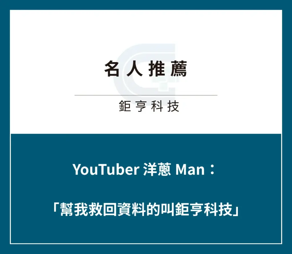 Youtuber影像創作者的硬碟等於是他們的經濟命脈,這次接到知名YTR洋蔥MAN的委託,鉅亨也拿出100%的專業來協助救援!幸不辱命!